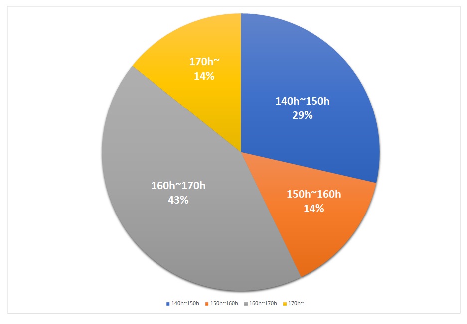 WEBシステム開発チーム系は安定して平均150h前後の稼働となりますが、制御開発系チームは平均160h前後の稼働となっています。